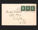 DescriptionA cream-colored stamp cover from England addressed to (handwritten in ink): President Roosevelt / White House / Washington / D.C. / U.S.A. There is no return address. Adhered in the upper right of the envelope are three British 1937 green ½p King George VI stamps (Scott 235). The envelope is postmarked Brighton and Hove, Sussex, June 1, 1939.