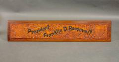 DescriptionA wood and hand-tooled leather nameplate for Franklin Roosevelt. Surrounded by various tooled designs, including an eagle and a patriotic shield, is FDR's name in black: President / Franklin D. Roosevelt. The leather portion is mounted into a stained-wood stand. Attached to the reverse of the stand is a 2½" x 4½" tooled leather label that reads: COMPLIMENTS / OF / SADDLER'S SCHOOL / THE CAVALRY SCHOOL / FORT RILEY, KANSAS / MAKER ~ SGT. A. C. GREEN.