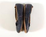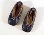 DescriptionA pair of black leather baby shoes lined with tan colored fabric. The shoes have ankle straps with Bakelite buttons and silver shoe buckles.