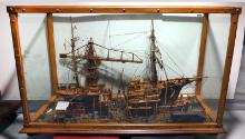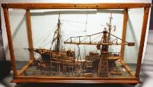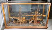 DescriptionA scale diorama (1:50) of an Italian ship under construction in a shipyard. The bow half of the ship shows the manual construction methods employed in the 1870s, while the stern half is the same boat as it would have been built about 1915-1920 with mechanical equipment. The model is encased in the original wood and glass case.