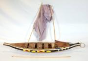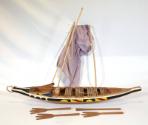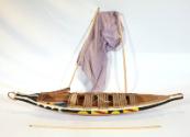 DescriptionA model of a Lele (possibly an African Dhow) sailing boat. The wooden boat has a plain hull with white, black, yellow, and red trim. The boat comes with fabric sails which are currently dismantled, as well as three fork-shaped oars and one plain oar.