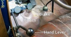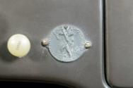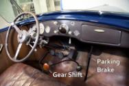 On the interior, the steering wheel has a chrome and Bakelite center with a Ford V8 symbol. The dashboard has three gauges -- oil/fuel, speedometer, and temp./amp. -- as well as two knobs for the throttle and the choke. The start button is on the left. A metal cigarette dispenser is fixed to the steering wheel shaft with a button to light the dispensed cigarette. The bench style seats in the front and back are covered in brown leather. There is a black rubber floor mat on the floor of the back seat. On the passenger's side is a glove compartment in which is a small cardboard box labeled: Self Closing Monkey Link. To the left of the glove compartment is a St. Christopher medal fixed to the dash.