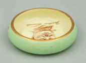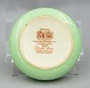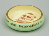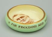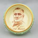 DescriptionA Franklin D. Roosevelt commemorative dish. The small, round, bowl-like fine bone china dish is white at the center with a mint green exterior and a gold-painted rim. At the interior center of the dish is a sepia-tone drawn portrait of FDR’s head and shoulders with his name below, “President Roosevelt.” Along the outer edge is sepia text that reads: "FOR FREEDOM AND DEMOCRACY."