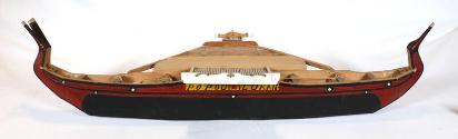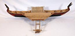 DescriptionA model of the Yapese outrigger canoe, POPOU LUKAN. The wooden canoe has a black hull with red, white, and black trim. On one side of the canoe is the name: POPOU LUKAN. The model includes a removable platform that sits on top of the canoe.
