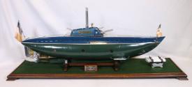 Label TextFree French leader General Charles DeGaulle gave President Roosevelt this working model of a submarine during a visit to Washington D.C. in July 1944. Based loosely on a French submarine called the SURCOUF, the model can submerge, fire its guns, and launch its torpedoes. The model was built by an unknown French petty officer in Bizerte, Tunisia while it was under German occupation. A delighted Roosevelt tested the model in the boat basin at the Taylor Naval Research Center near Washington D.C. He later gave it to his grandson, Curtis Roosevelt. When Eleanor Roosevelt noted that he couldn’t give away a state gift, FDR replied that DeGaulle was president of the French Committee for Liberation, not a head of state.