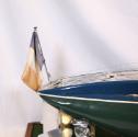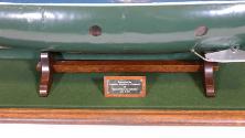 DescriptionA scale model of the Free French submarine, FRANCE. The metal submarine has a green hull, blue upper section, and white trim. The model sits on a wooden cradle stand mounted to a wood base covered in green fabric. Also mounted to the base is a set of four torpedoes Affixed to the base is a metal and wood presentation plaque inscribed: Presented to / President Franklin D. Roosevelt / by General Charles DeGaulle / July 9, 1944