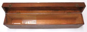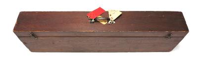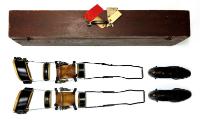 5) A custom wood traveling case made to hold the leg braces and shoes. The case has a hinged lid with a metal handle and latches. Paper travel tags are attached to the handle.
