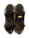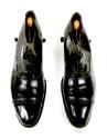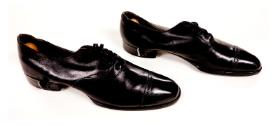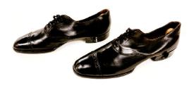 3-4) A pair of black leather Florsheim shoes made especially to be used with leg braces. Inserted into each shoe is a wood and metal shoe tree.