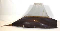 DescriptionA dismasted ship model hull. The wood hull is made of dark stained wood and has a metal rudder at the bottom. A gilded figurehead of a horse is located at the bowsprit, which is attached with wire to the underside of the hull. On the deck are metal fixtures where the masts were fastened.