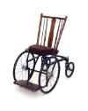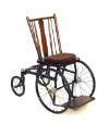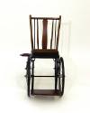 DescriptionA small, armless wheelchair. The wooden seat (a modified kitchen chair with the number "18" underneath) is mounted on a black metal frame with two large wheels at the front, two small pivoting wheels at the back, and a wooden footrest (number "17" underneath). The seat has a removable rubber sponge cushion covered with brown velvet fabric. A swivel mounted glass ash tray is installed on the right side of the wheelchair.