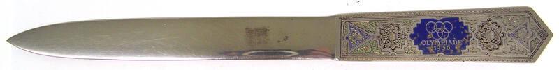 DescriptionA silver-plated letter opener for the 1936 Olympiad. Both sides of the aluminum handle are decorated in a blue, green, black, and gold inlaid motif. The Olympics' five-ring emblem is one side of the handle with the text: OLYMPIAD / 1936. There is no manufacturer's information.