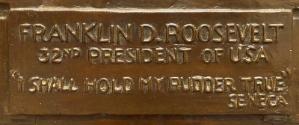 DescriptionA heavy bronze plaque featuring a bas-relief head and shoulders portrait of Franklin Roosevelt. Both his body and head are turned partially to the left of the plaque, and he is shown wearing a suit jacket, shirt, and tie. Flanking the portrait are decorative columns around which are entwined leafy vines. At the top of the plaque is a high relief eagle with outspread wings. Below the portrait is a raised inscription that reads: FRANKLIN D. ROOSEVELT / 32ND PRESIDENT OF USA / "I SHALL HOLD MY RUDDER TRUE" / SENECA. The artist's engraved name, the date, and a copyright symbol are in the lower right corner of the plaque: JOHN DE STEFANO "33" ©.