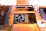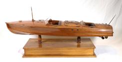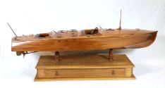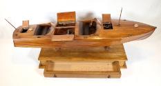 DescriptionA model of a motorboat named, PARDON ME. The varnished wood boat contains a small operational motor. Stitched on the red fabric flooring (simulating carpeting) of the back seat: F.D.R. The name of ship is on both sides of the bow. The model rests unfixed on a large wood stand containing one drawer with metal anchor handles.