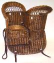 DescriptionA child's twin-seated pony saddle made of wicker with leather straps. The side by side seats face in opposite directions and each has a leather foot rest hanging in front. The base is arched to fit over the back of a horse and has a number of leather straps for attaching.
