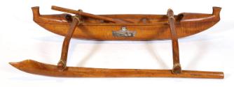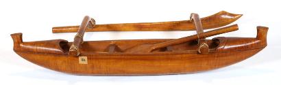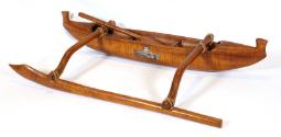 DescriptionA model of a Hawaiian outrigger canoe carved from one piece of highly polished brown Koa wood. The canoe includes one paddle. Attached to one side of the hull is an inscribed metal silver plaque reading: TO / PRESIDENT FRANKLIN D. ROOSEVELT / FROM / HAWAIIAN - JAPANESE CIVIC ASSOCIATION / JULY 1934. Mounted to the top of the plaque is a multi-colored enamel shield, presumably Hawaiian. On the starboard side of the hull is attached a small cardstock label with a number handwritten in ink: 44.