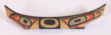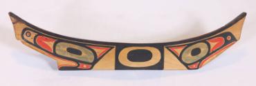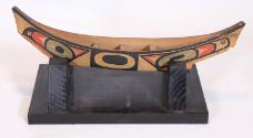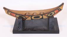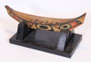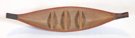 DescriptionA small model of a canoe carved from one piece of wood. The canoe has three seats and a high prow and stern. The exterior is painted in bold designs of green, black, and red. The model sits on dark stained wood cradle stand. A sticker with typed text is adhered to the underside: B-30-6.