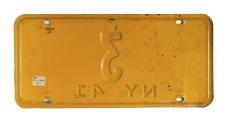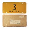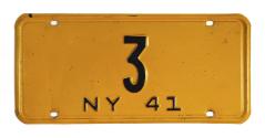 Descriptiona) A pressed metal New York State automobile license plate for 1941. On a golden yellow background, in black embossed letters and numbers, is the registration information: 3 / NY 41.