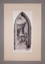 DescriptionAn original pen and ink and ink wash drawing with gouache highlights showing the vestry room, as seen through a Gothic arched doorway, of St. James Church in Hyde Park, New York. The drawing is signed by the artist in ink in the lower left below the image: Olin Dows © 1949.