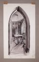 The drawing is mounted to a piece of cardboard and comes with a window mat on which the title is written in pencil: The Vestry Room.