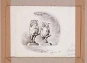 Label TextThis drawing is one in a series of original ink wash drawings created by Olin Dows for his book, "Franklin Roosevelt at Hyde Park," published in 1949 by American Artists Group, Inc. Olin Dows spent two years writing the text and drawing the book's 174 illustrations. This illustration appears on page 49 of the book where it is captioned: TWO SCREECH OWLS FROM THE CASE OF STUFFED BIRDS IN THE HALL AT "SPRINGWOOD".The drawing is mounted to a piece of cardboard and comes with a window mat on which the title is written in pencil: Screech Owls.