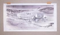 On the reverse of the drawing is a handwritten note in ink describing the image: Sailing the model boats in the Hudson - This is just [illegible] the tracks from the siding - F.D.R. would sit in the stern - Louis Howe in the bow and Lewis Delano would row. They would [illegible] at one time - Cropley raced with them. The boats would cross the river followed by the row boats.
