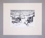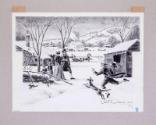 DescriptionAn original pen and ink and ink wash drawing with gouache highlights showing an 1820 winter farm scene in Hyde Park, New York. In the foreground, flanked by a house and a barn, a family is walking through the snow toward a young man running alongside a dog. Behind them travels a horse-drawn sleigh. The circa 1797 Quaker meeting house at Crum Elbow is seen in the background. The drawing is signed by the artist in ink in the lower right of the image: Olin Dows © 1949.
