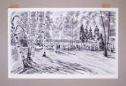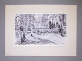The drawing is mounted to a piece of cardboard and comes with a window mat on which the title is written in pencil: Val-Kill Picnic.