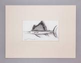 The drawing is mounted to a piece of cardboard and comes with a window mat on which the title is written in pencil: Sail Fish.
