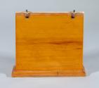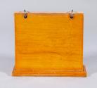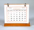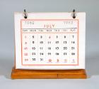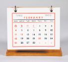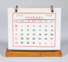 DescriptionA birdseye maple wedge-shaped upright calendar holder with six double-sided calendar cards for the year 1962 (two months on each card). The cards hang on metal rings allowing them to be flipped over to the opposite side of the holder. The maker of the calendar cards is printed on the bottom of each card: National Blank Book Co., Holyoke, Mass. / 55-921 / Made in U. S. A. [reverse side of each card]. The underside of the holder is lined with green felt. Also adhered to the underside of the holder is a round sticker with printed and written text that reads: ESTATE OF ELEANOR ROOSEVELT / NO. 946 / HYDE PARK, N.Y.