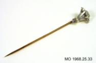 Descriptiona) A gold stickpin. The head of the pin is in the form of three feathers made of platinum and set with nine small diamonds and three seed pearls.