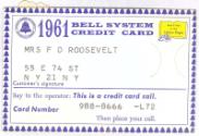 DescriptionA 1961 Bell System Credit Card, card number 988-8665 -L72. The card is made out to: MRS F D ROOSEVELT / 55 E 74 ST / N Y 21, N Y. The card is unsigned. The printed reverse has a grid to write phone numbers down.