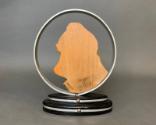 DescriptionA carved and colored wooden caricature portrait of Franklin D. Roosevelt in the form of a right-facing profile of his head. He is sporting a high collar and a pair of pince-nez glasses. The caricature is set into an open circle formed from a band of silver-colored metal that sits on an oval, two-tiered wooden base, painted black, with a metal band wrapped around each tier.