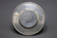 DescriptionA round, shallow, pewter ashtray. Set into the rim of the ashtray is a small, silver-colored medallion that features a bas relief right-facing profile image of FDR's head encircled by text that reads: • PRESIDENT • FRANKLIN • D • ROOSEVELT • / HYDE • PARK • N•Y•. The manufacturer's mark is stamped onto the reverse center of the ashtray: VALKILL / HYDE PARK • N•Y• [encircling image of anvil].