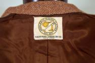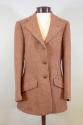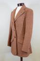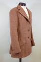 DescriptionA brown herringbone tweed riding jacket. The single-breasted jacket has a notched lapel with a lapel hole, three leather-covered front buttons, two slanted flap pockets, an external breast pocket, single button cuffs, and a single rear vent. The interior of the jacket is lined with dark brown fabric. Sewn onto the lining, below the hanging loop, is the manufacturer's label: SADDLEBILT RIDING CLOTHES / EST. 1875 / KAUFFMAN SADDLERY CO. / NEW YORK.