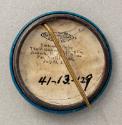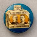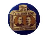 DescriptionA round pinback jugate campaign button. At the center of the blue button is a sepia halftone illustration of a metal lunchbox, or dinner pail, with a drinking mug mounted upside down on the top. On the front of the container are the portraits of William McKinley and Garret Hobart, along with the text: EMPLOYMENT / FOR / LABOR / A FULL DINNER BUCKET / PROSPERITY / SOUND MONEY-GOOD MARKETS. The manufacturer's information is printed on a paper insert on the reverse of the button.