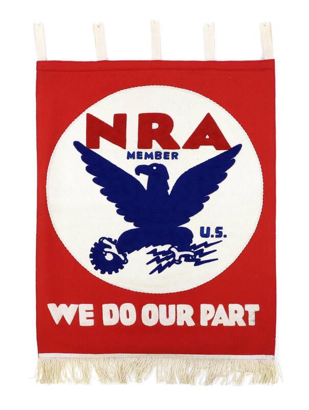 Participating businesses, consumers, and individuals proudly displayed the NRA’s blue eagle symbol on a variety of items, like this wall hanging, to proclaim their participation in the program and show their support.