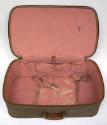 DescriptionA brown canvas suitcase with rounded edges and corners, trimmed in leather. There is a zippered closing that travels over three sides of the suitcase. A small oval leather label mounted beneath the exterior handle has Eleanor Roosevelt's initials in gilt lettering: E. R. Six metal half-balls form protective feet on the exterior bottom of the suitcase. The interior of the suitcase is completely lined with pink fabric and has two straps. A series of pockets line the back interior wall. Four small metal safety pins (one pink) are attached to the interior of the lid. The manufacturer is not indicated.