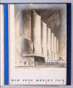Label TextThe 1939 New York World's Fair, located in Flushing Meadows, New York, opened on April 30, 1939 and closed on October 27, 1940. President Franklin D. Roosevelt gave the opening speech in person which was televised throughout the Fair. His address was the first time that a president appeared on television.The book contains photostatic copies of seven plans and drawings (several of which are by T. Kautzky and C. M. Flynn) of the proposed Federal Buildings and the Avenue of Nations, each page separated by a sheet of handmade paper. Each print is mounted on a silk-screened cardboard page with blue and orange text at the bottom reading, "NEW YORK WORLD'S FAIR / 1939." Also on each page, the title of the print is handwritten beneath it in charcoal pencil. The titles are: