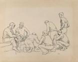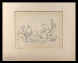 DescriptionAn original ink and pencil sketch of military guards at the U.S. Treasury. The drawing depicts a group of seven casually dressed men involved in a game of craps taking place on the floor in front of them. Shown in various positions - standing, crouching, kneeling, and seated on ends of cots - the men are watching one of the players roll the dice. The artwork sheet is initialed by the artist in the lower right: M.J.