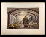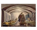 DescriptionAn original ink and watercolor sketch of military guards at the U.S. Treasury. The sketch depicts a room (presumably in the basement of the Treasury building) with a vaulted ceiling, block walls, a window, and a door. Two rows of cots - one row along each wall - are arranged in the room and on each cot a soldier, in full or partial uniform, is relaxing or sleeping. In the center of the room is a wooden A-frame gun rack that holds rifles, and a wooden bar on which clothes are hanging. A large shelving unit is in the back right corner of the room. The artwork sheet is signed by the artist along the bottom edge: Mitchell Jamieson.
