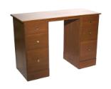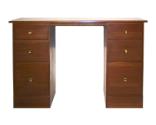 DescriptionA small, simple, pedestal-style pine desk with walnut stain. Each side of the desk has three drawers, each with a single brass knob pull. The two bottom drawers are deeper and have a wooden divider running the depth of the drawers. The drawers are all lined with white liner paper.