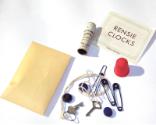 The following contents are located in the upper left drawer: a red plastic thimble; a tube of Roger and Gallet lip pommade; a small paper pamphlet for Rensie clocks; and a small manila envelope containing three blue fabric-covered buttons, two black safety pins, two hair pins, two miniature keys on ring, a straight pin with ball end, and a piece of string.