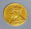 Label TextThis medal, struck in commemoration of the 1939 visit of Britain's King George VI and Queen Elizabeth to Canada, was sent to Franklin D. Roosevelt by Canadian Prime Minister Mackenzie King in July 1939. The medal is one of only six gold medals struck for the occasion, two of which were presented to the King and Queen.OBVERSE: Left-facing conjoined profiles of the heads of King George VI and Queen Elizabeth, both wearing crowns. The initials of engraver Percy Metcalfe - "PM" - are on the lower right side.