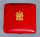 b) A red leather presentation/storage case for the medal with the Royal Coat of Arms of Canada in gold on the cover. The interior of the box is lined with white satin and purple velvet. Stamped on the interior of the cover is the logo of the Royal Canadian Mint.