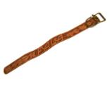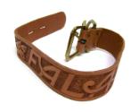 Descriptiona) A tooled leather dog collar with a brass buckle and hardware. Tooled into the brown leather collar is the name "FALA" flanked by flower and leaf designs. A small anchor shape is pressed into the underside of the metal buckle.