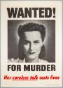 DescriptionA poster promoting wartime discretion. The poster features a black and white photographic headshot portrait of a woman. The photographer’s facsimile signature is in the lower left corner of the image: Victor Keppler. Black and red lettering above and below the image reads: WANTED! / FOR MURDER / Her careless talk costs lives.