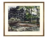 DescriptionA watercolor painting of the bridge on the Val-Kill property in Hyde Park, New York. It depicts a low bridge with wood rails crossing over a narrow creek. The bridge leads onto a road with a wooded area in the background. The painting is signed by the artist in the lower right: Mitchell Jamieson.