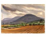 On the reverse of the sheet is what appears to be a completed - and unrelated - landscape watercolor painting of fields and a pond backed by mountains. The landscape scene has been crossed out in pencil, and a pencil notation added regarding the image on the front: No 7 - / sleeping quarters no. 1.