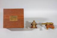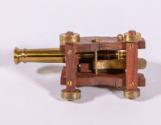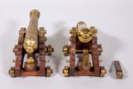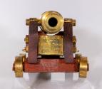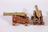 Label TextPresident Roosevelt received these models during his August 18, 1938 visit to Kingston, Ontario, Canada to receive a degree at Queens College, and to participate at the dedication and opening of the Thousand Islands Bridge.Each of the identical cannon models consists of a brass gun fastened with brass hardware to a rolling teak wood gun carriage with brass wheels. The guns swivel up and down on the carriages, and each carriage has a removable wedge-shaped piece of wood with a brass knob that rests beneath the gun and allows the angle of the gun to be adjusted. Mounted to the front of each gun carriage is a small brass plaque with an engraved inscription that reads: SOUVENIR / - OF - / OLD FORT HENRY / KINGSTON, CANADA / AUG. 1938.