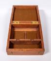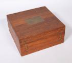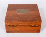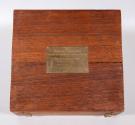 The custom wood presentation/storage case for the models has a hinged lid, brass hardware, wood inserts, and interior felt lining. A brass plaque, inset into the exterior of the cover, has an engraved inscription that reads: PRESENTED / TO / FRANKLIN D. ROOSEVELT / PRESIDENT OF THE UNITED STATES OF AMERICA / BY / THE CANADIAN LEGION / KINGSTON CANADA / AUGUST 18TH 1938 / THE TEAKWOOD COMES FROM THE ORIGINAL / GUN CARRIAGES AT FORT HENRY USED DURING / THE WAR OF 1812.